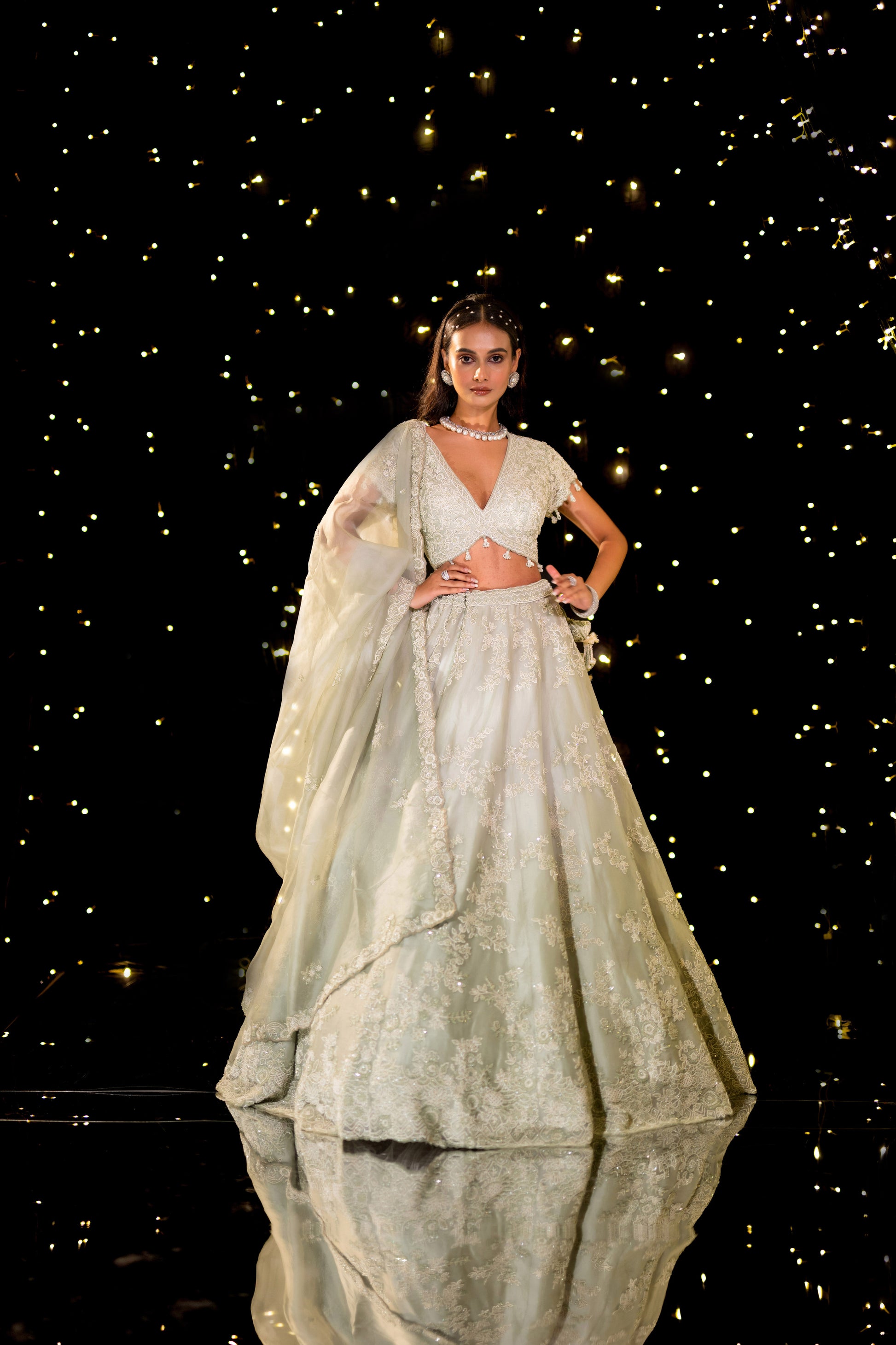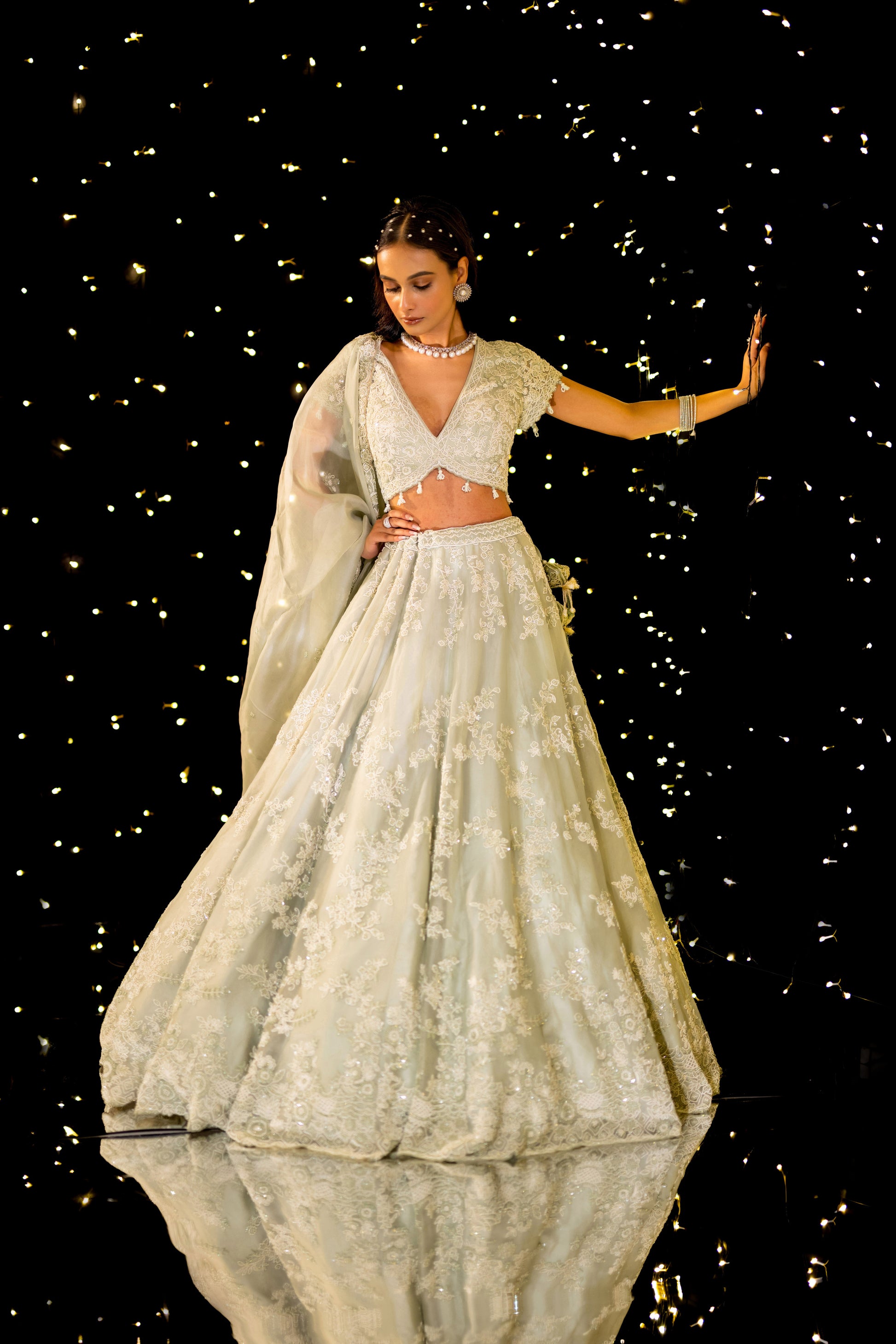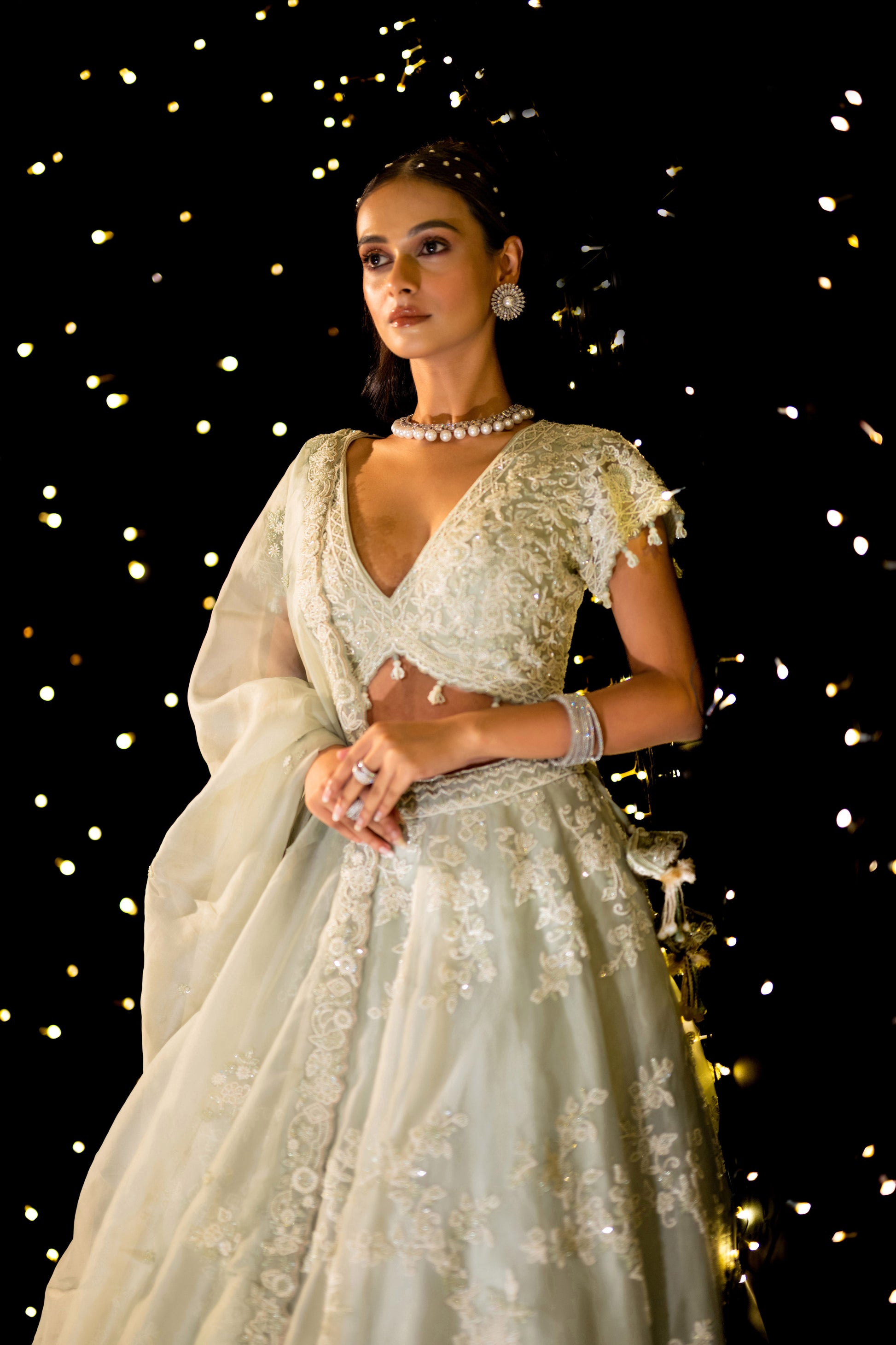 An exquisite ivory floral gown, draped in elegance with intricate hand-embroidered pearl, thread, and cutdana details. A vision of sophistication, this ensemble radiates grace, making every moment feel like a fairytale.