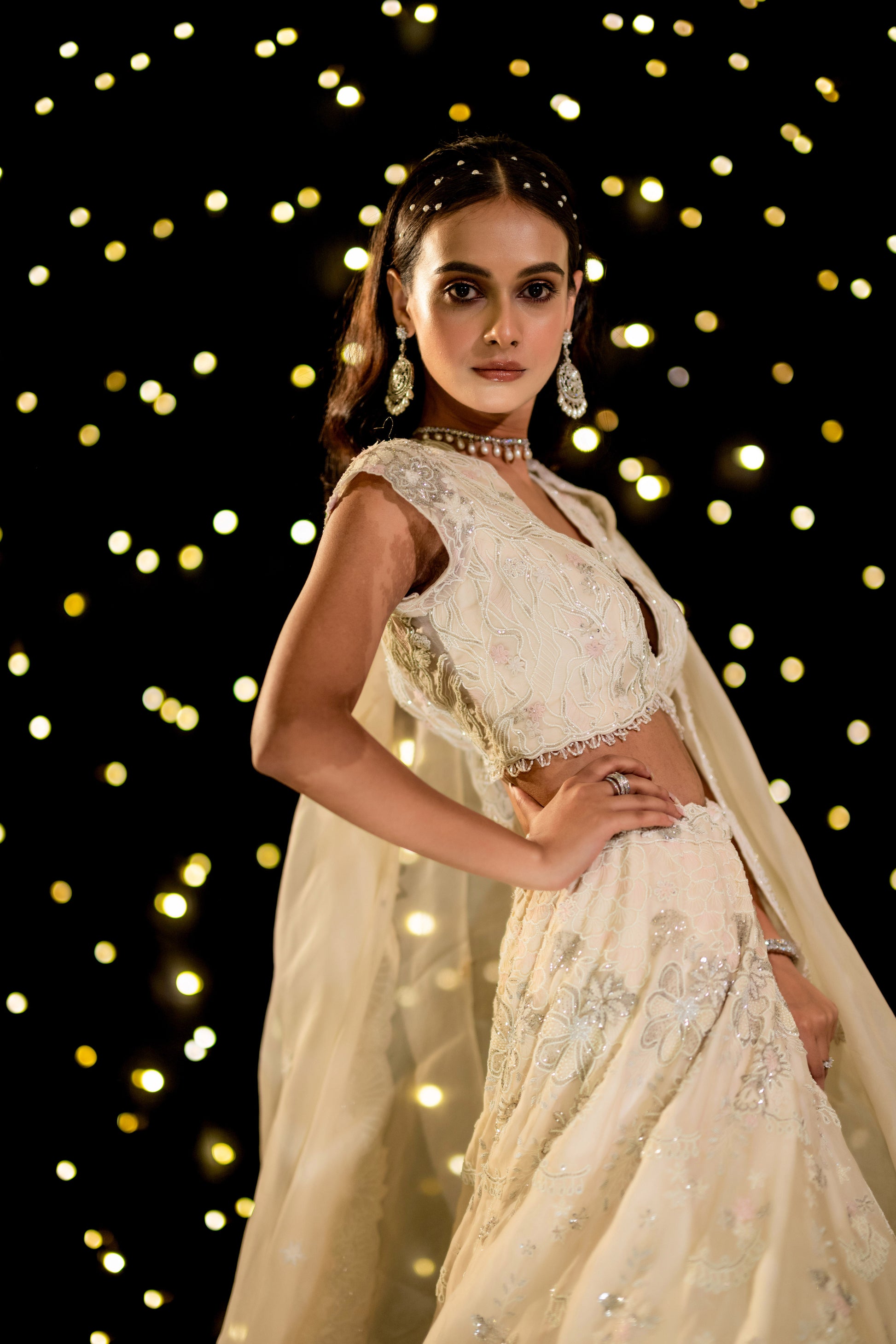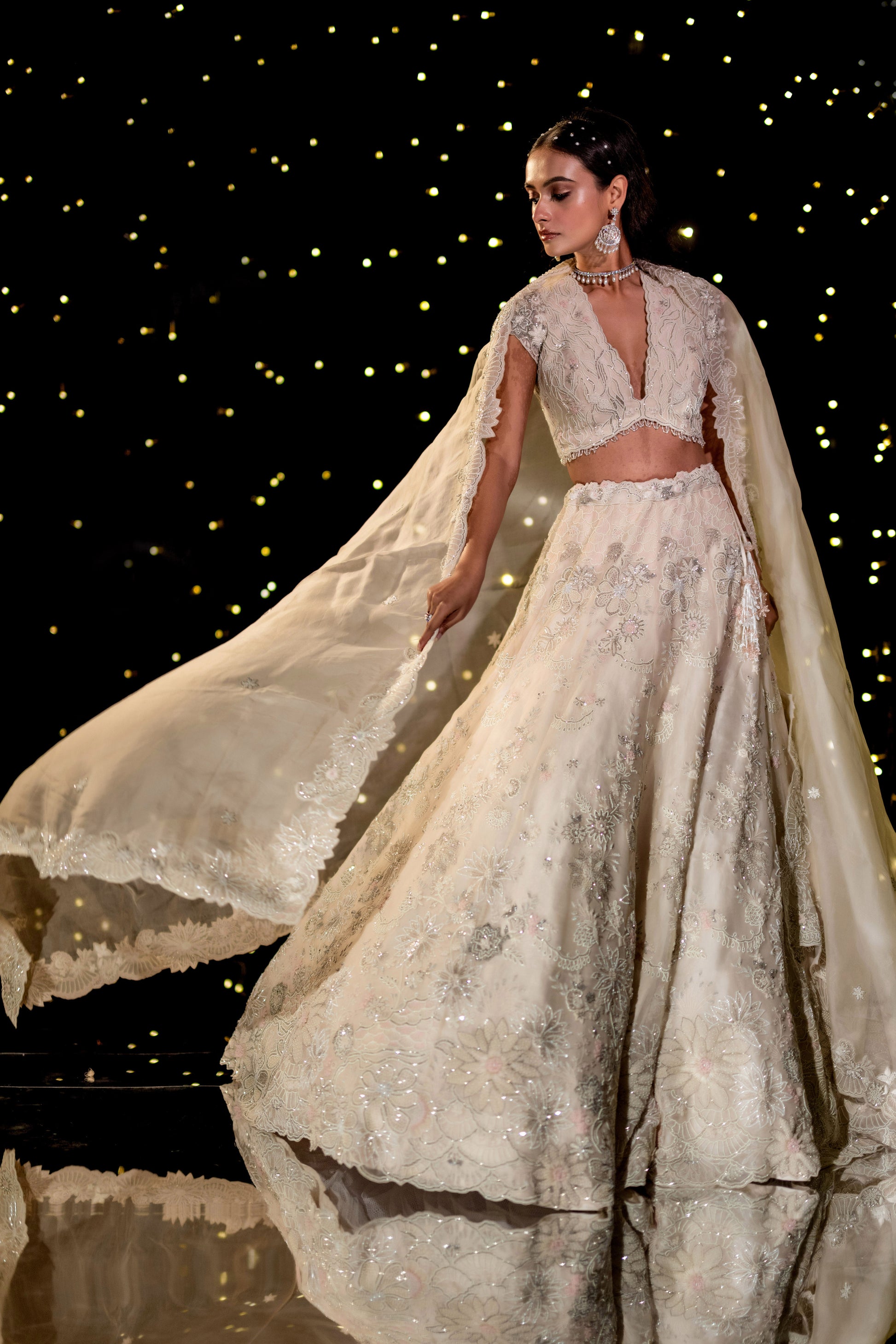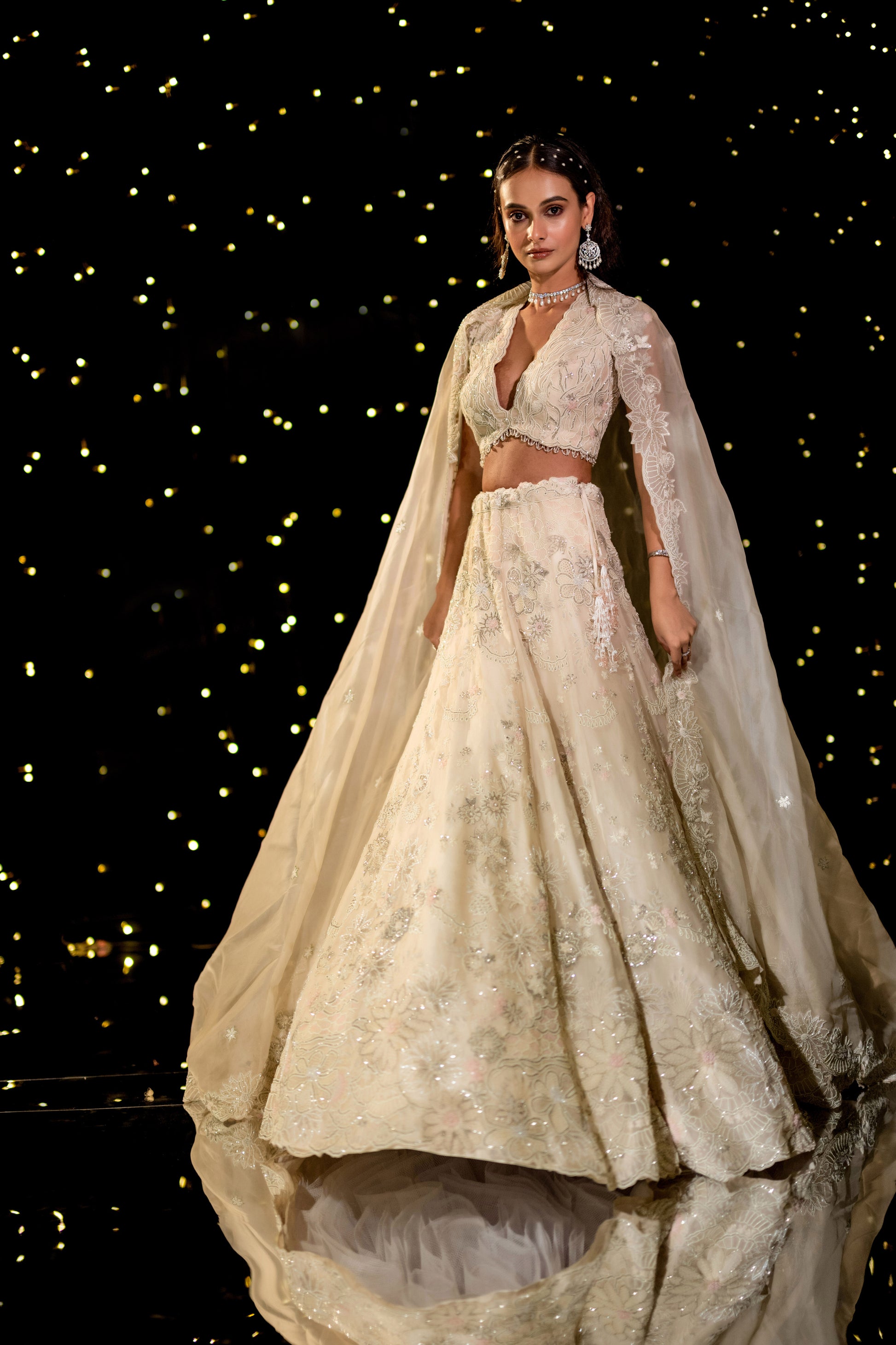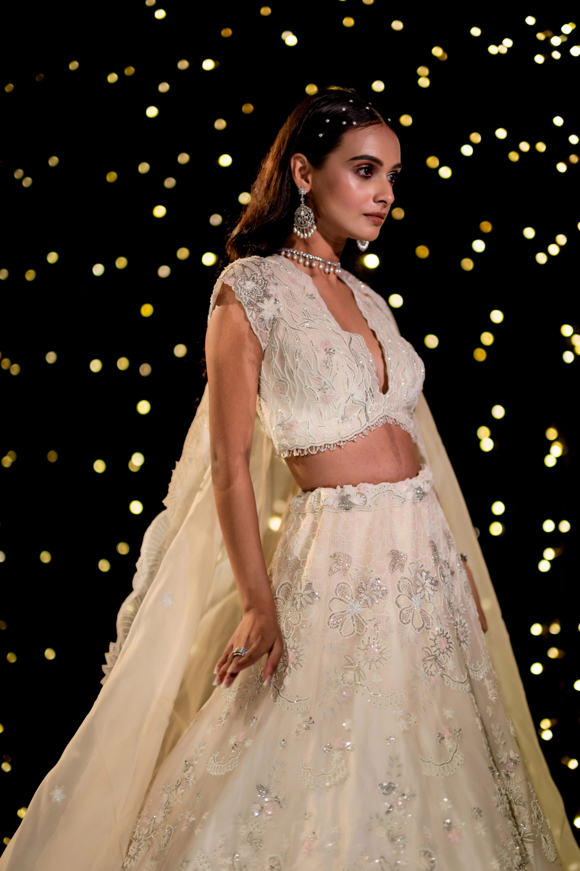 An exquisite ivory floral gown, draped in elegance with intricate hand-embroidered pearl, thread, and cutdana details. A vision of sophistication, this ensemble radiates grace, making every moment feel like a fairytale.