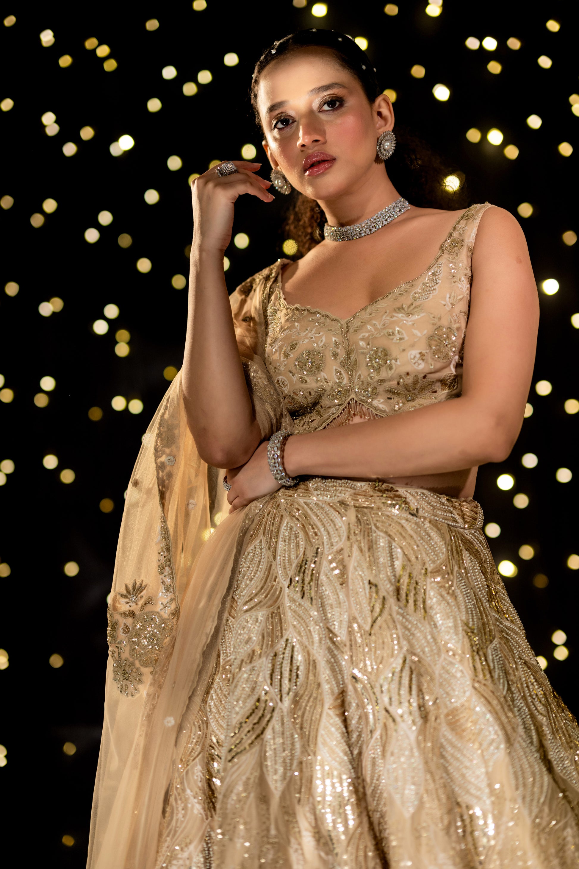 An exquisite ivory floral gown, draped in elegance with intricate hand-embroidered pearl, thread, and cutdana details. A vision of sophistication, this ensemble radiates grace, making every moment feel like a fairytale.