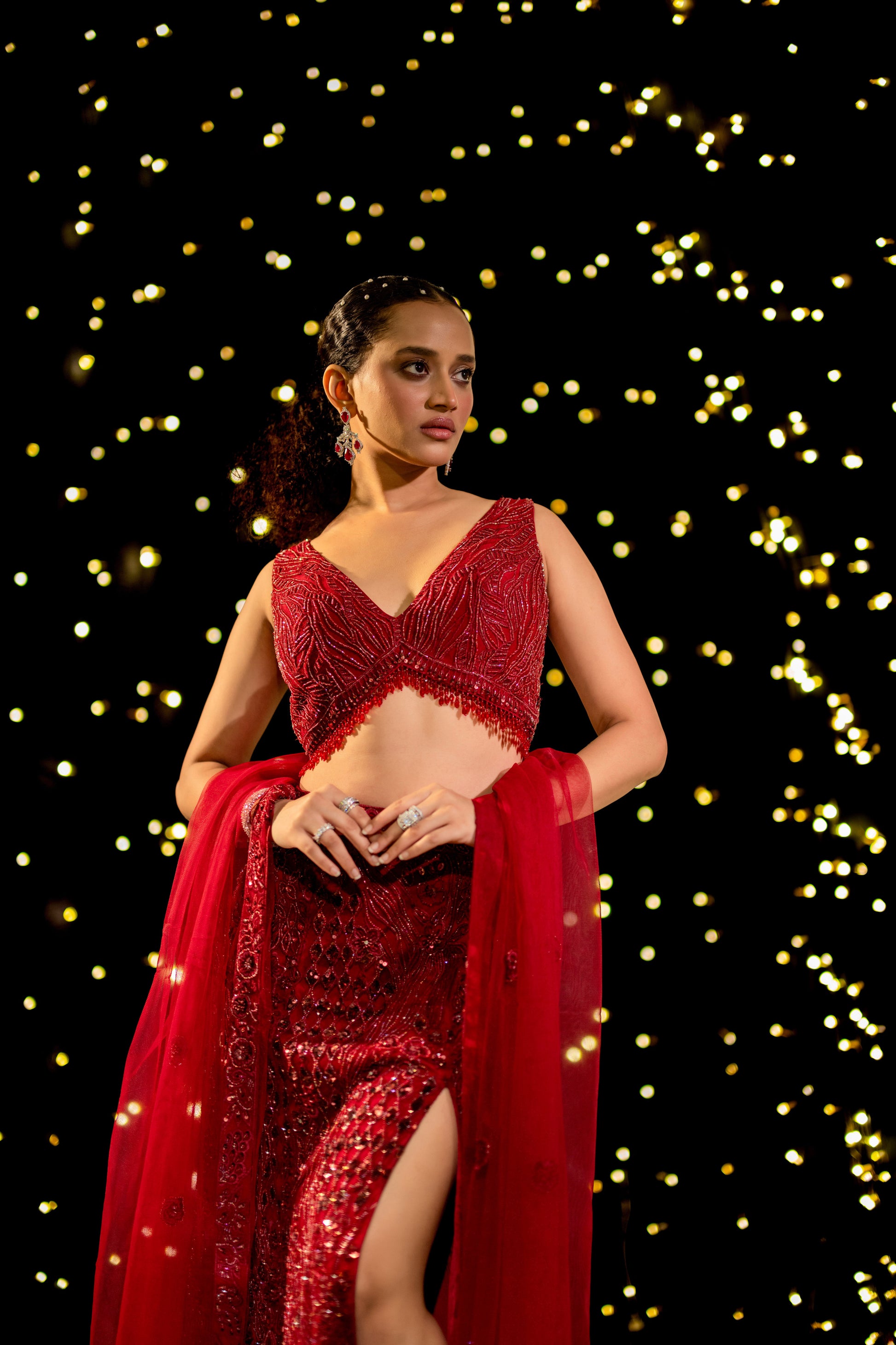 An exquisite ivory floral gown, draped in elegance with intricate hand-embroidered pearl, thread, and cutdana details. A vision of sophistication, this ensemble radiates grace, making every moment feel like a fairytale.