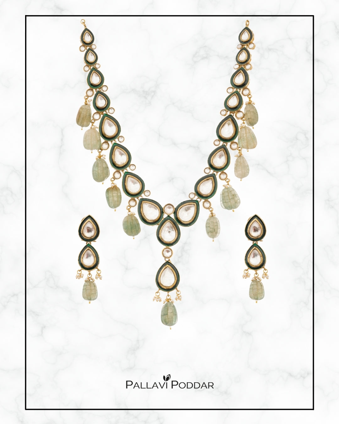 Inspired by the treasures of the earth, Ratnagarbha embodies the beauty of nature’s finest gemstones. This statement necklace set features striking green stone drops paired with uncut polki, delicately framed in gold with hints of enamel work. The cascading design lends fluidity and grace, making it a perfect choice for both grand celebrations and intimate occasions. Elegant yet bold, Ratnagarbha celebrates the timeless bond between tradition and contemporary artistry, offering a piece that feels as rare and precious as the gems it carries.
