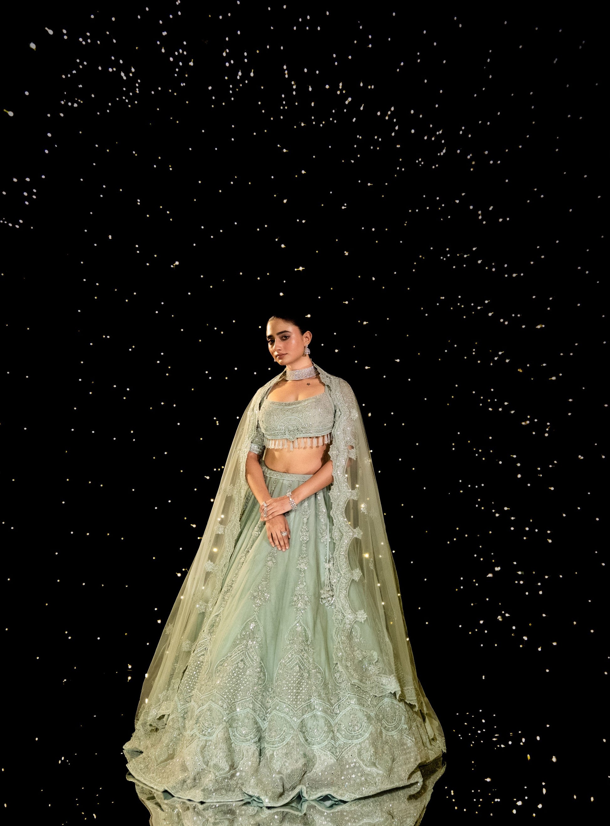 An exquisite ivory floral gown, draped in elegance with intricate hand-embroidered pearl, thread, and cutdana details. A vision of sophistication, this ensemble radiates grace, making every moment feel like a fairytale.