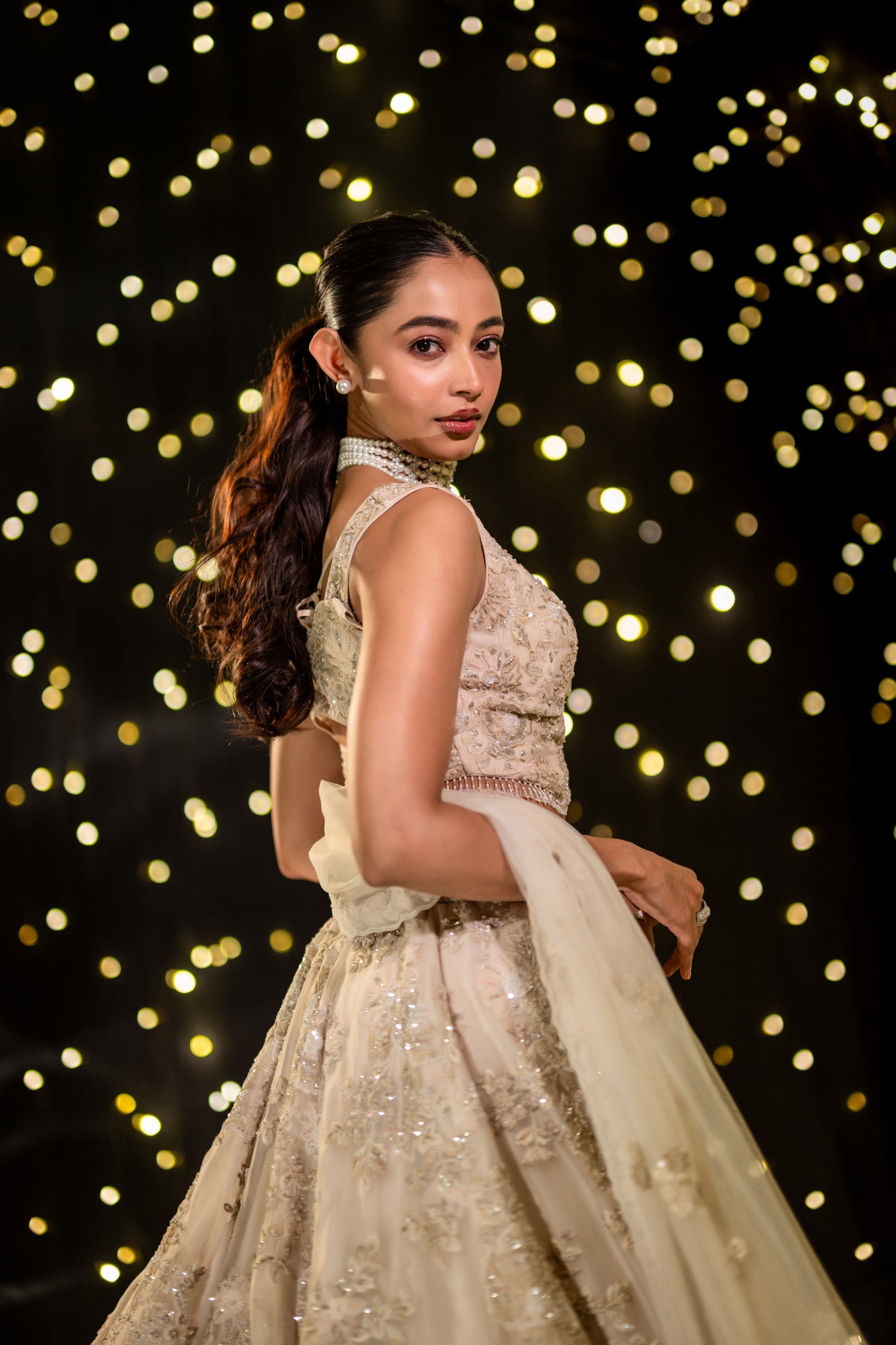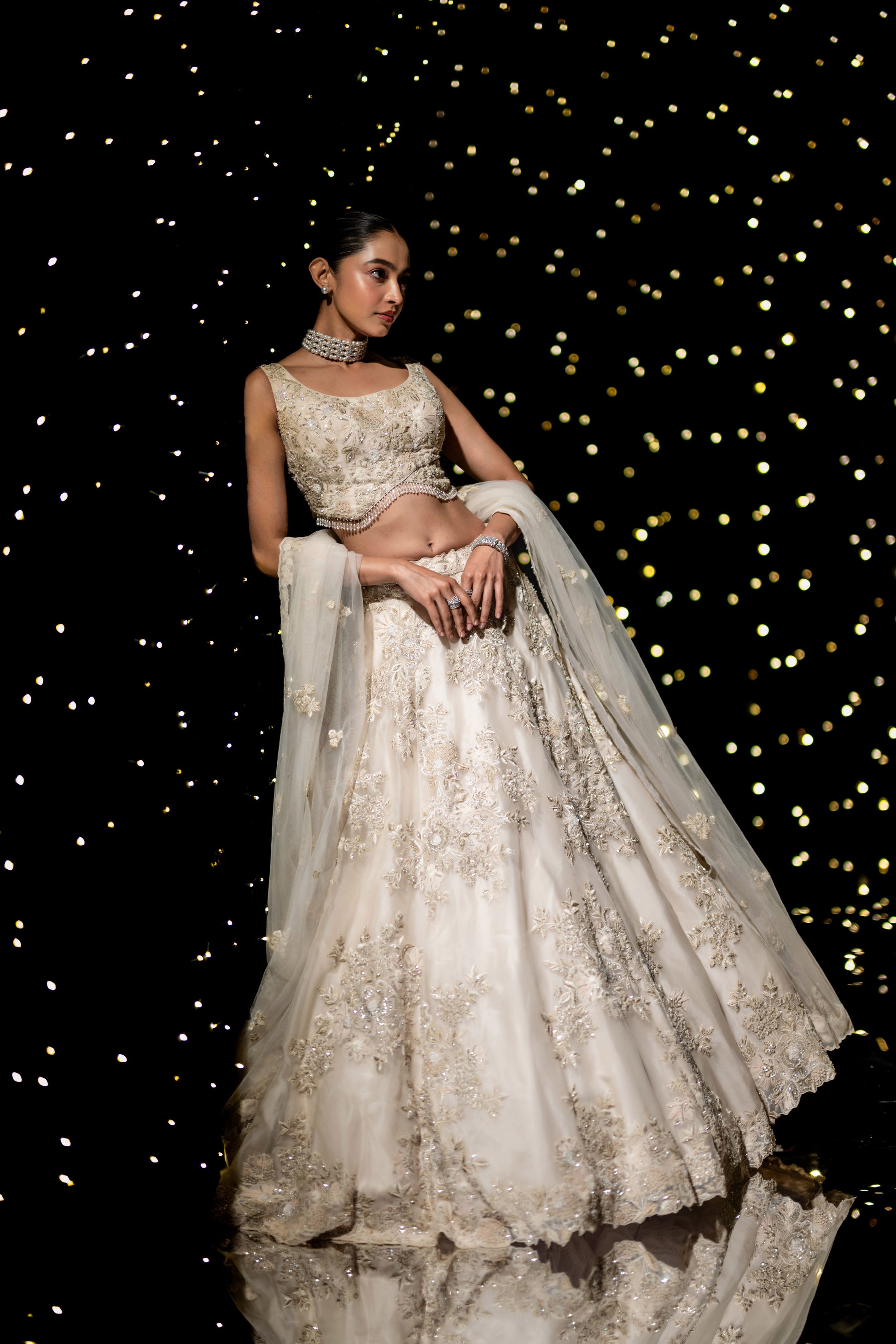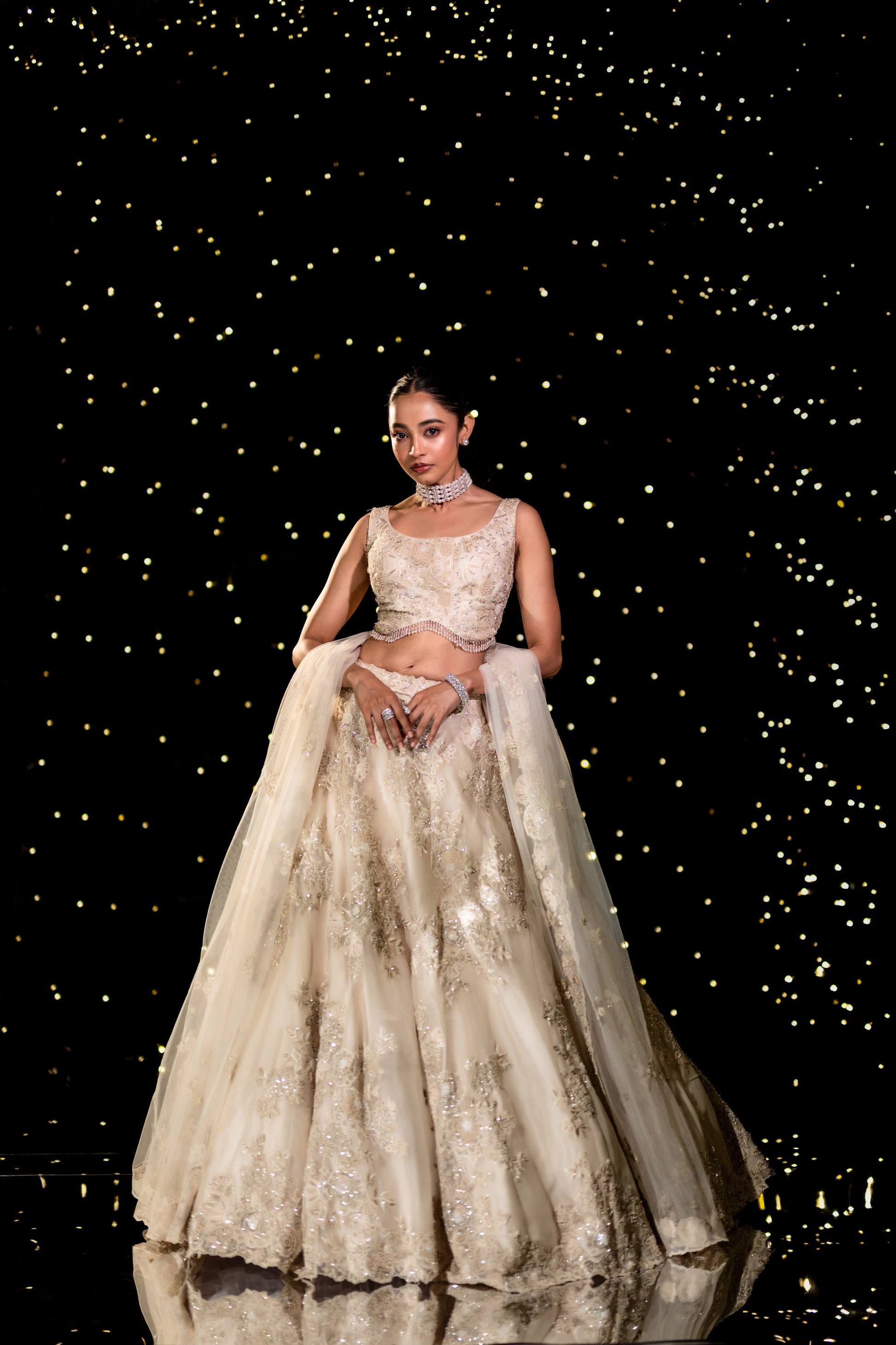 An exquisite ivory floral gown, draped in elegance with intricate hand-embroidered pearl, thread, and cutdana details. A vision of sophistication, this ensemble radiates grace, making every moment feel like a fairytale.