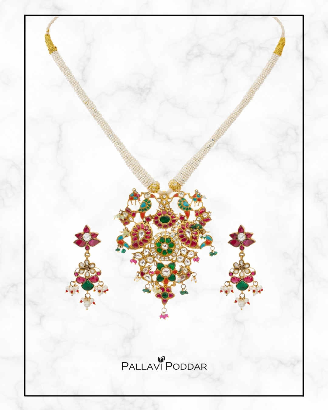 A celebration of artistry and tradition, Muktavali is a resplendent jewel that captures the vibrance of heritage in every detail. Designed with delicate strings of pearls leading to a grand pendant, the piece is adorned with vivid enameling in hues of green, ruby red, and gold. Intricately crafted motifs of peacocks and florals bring life and movement to the design, while the surrounding polki stones enhance its regal allure. Paired with statement earrings that mirror the pendant’s elegance, Muktavali embodies festivity, grace, and the timeless splendor of cultural craftsmanship.